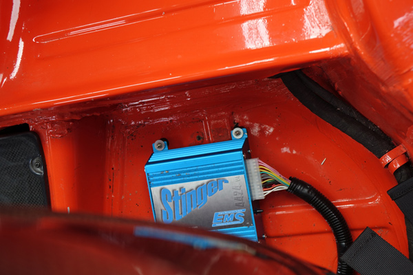 - Komplett neues Motorsteuergerät Typ EMS - Stinger V4 frei programmierbar, abgestimmt auf Rollenprüfstand (356 PS / 364 Nm) (als ich das Auto übernahm war es unfahrbar und hatte auf dem Rollenprüfstand knapp 200 PS; viel zu fett etc.) Jetzt läuft es super; springt sicher an und hält problemlos die Leerlaufdrehzahl im Stand
