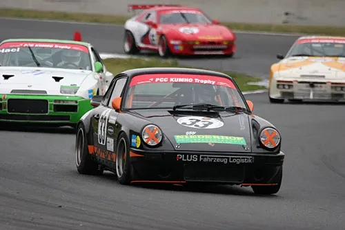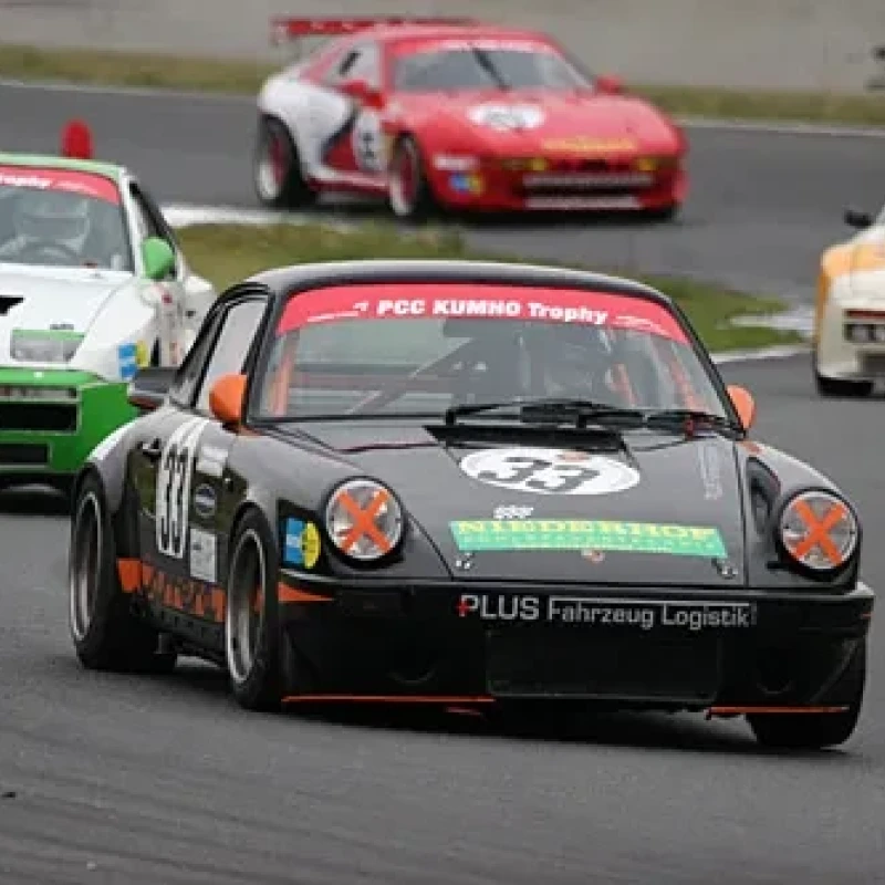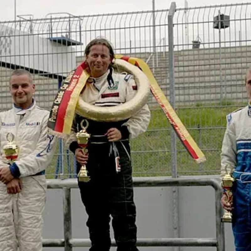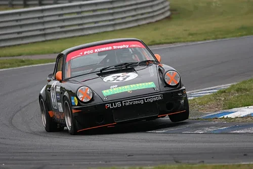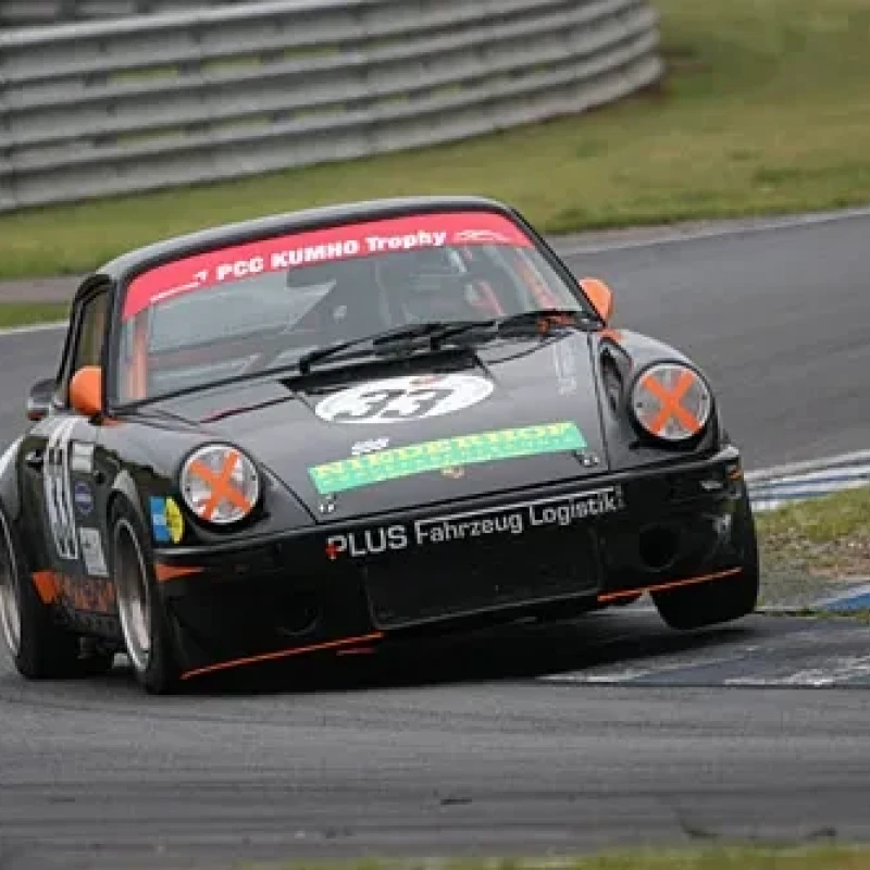 Reifen montiert. Nach dem fliegenden Start rasen Mathias Dankmer und Thomas Wasel auf die erste Schikane zu. Dankmer konnte seine neue Bremse und die neuen Reifen auf der sehr kurzen Einführungsrunde nicht auf genügend Temperatur bringen, so dass er sich auch prompt beim ersten Bremspunkt an der Schikane einen Dreher leistete. Wasel konnte durchrutschen und war erstmal für Dankmer außer Sicht. Er hetzt also dem Feld hinterher, jagt Achim Trappehl im 944 Turbo, der wiederum verringert seinen Abstand zum 944 Turbo von Haci Köyüren. Dankmer lässt Trappehl hinter sich und fährt jetzt rundenlang mit seiner Stoßstange im Heck von Köysürens Turbo herum. Die Zwei fahren Runde um Runde so dicht hintereinander her, dass man glauben könnte Dankmer hängt bei Köysüren an der Abschleppstange. In der letzten Runde zeigt der Mann aus Rammsee, der erst in seiner zweiten Saison Autorennen fährt, sein Können, überholt Haci Köysüren und den 928GT 2 vom Team Heinrich, um mit gestreckter Faust aus dem Fenster seines 911 als Zweiter hinter Thomas Wasel mit 5.115 sec. Abstand die Ziellinie zu überqueren.