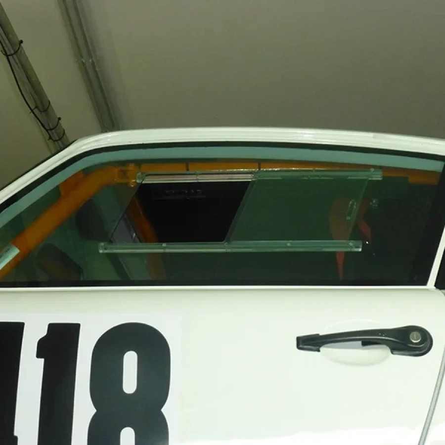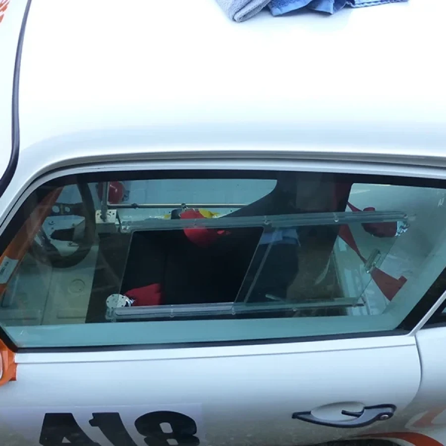 Durchgehende Scheibe ohne Mittelsteg für Renntür - mit Rahmen. Auswahl mit oder ohne Schiebefenster in der jeweiligen Ausrichtung.